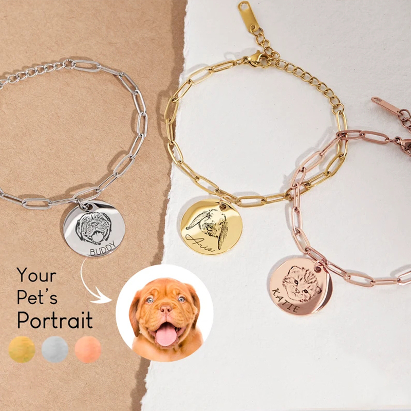 Chiamando tutti gli amanti degli animali! Il nostro braccialetto per animali domestici è il regalo perfetto. Personalizzalo con il ritratto e il nome o il soprannome del tuo animale domestico e scegli tra i nostri caratteri eleganti per un tocco speciale. Il suo design delicato garantisce un'usura confortevole, mentre il sentimento dietro di esso promette anni di cari ricordi.