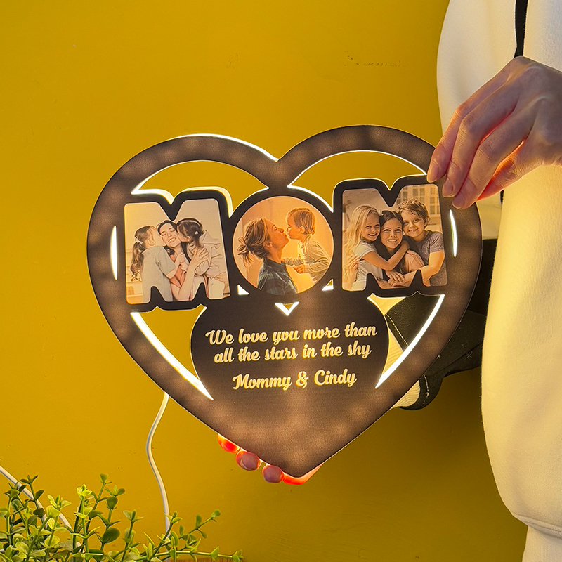 In questa festa della mamma, esprimi il tuo amore e la tua gratitudine a tua madre con un regalo unico di luci e ombre! La nostra luce notturna personalizzata a forma di cuore per le mamme, con la sua calda forma a cuore "MOM" e le opzioni di personalizzazione ponderate, creerà una sorpresa speciale per la festa della mamma per te.